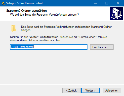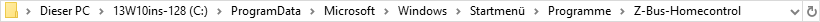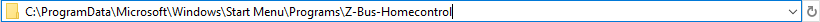 Nach Bestätigung erscheint dort die "Brotkrumen"-Ansicht des Pfades zum Startmenü. Im Bild (s.u.) ist bereits der Startmenü-Unterordner Programme > Z-Bus-Homecontrol geöffnet:
