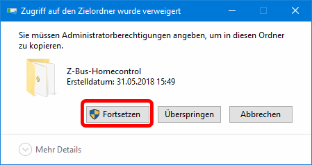 Windows 10 64bit kennt zusätzlich 64bit-Programme und installiert 32-bit-Programme in den Systemordner C:\Program Files (x86) ((C:\Programme (x86) )) und 64-bit-Programme in den Systemordner C:\Program Files ((C:\Programme)). Daher kennen Windows 10 32- und 64bit noch den Systemordner C:\ProgramData , in den regulär installierte Programm ihre "Hilfsdaten" ablegen dürfen. Aber C:\ProgramData ist für den Anwender nur sichtbar, wenn im Dateimanager > Ansicht > Optionen > Ansicht | versteckte Dateien und Ordner die Option Ausgeblendete Dateien, Ordner und Laufwerke anzeigen aktiviert ist. U.a. dieser Ordner ist schuld daran, dass viele Programme aus der XP-Zeit nach Standardinstallation (also in C:\Program Files ...) schlecht oder gar nicht laufen. So darf z.B. Z-Bus-Homecontrol keine Daten in C:\Program Files (x86) schreiben; die müssten eigentlich nach C:\ProgramData, aber das kennt Z-Bus-Homecontrol nicht. Die Abhilfe ist leicht: Installation des Z-Bus-ControllersInstallieren Sie die Z-Bus-Homecontrol in einen selbstgewählten Ordner, der keinen Windows-Restriktionen unterliegt, z.B. in C:\Progs\. Die Installation läuft dann folgendermaßen ab (alle Bilder wurden unter Windows 10 erstellt):