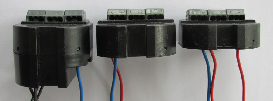 Wir schlagen daher mittlerweile den äußers kleinen Typ 221 vor, den es mit zwei bis fünf Klemmstellen gibt. Fa. Zimmermann prüft derzeit, ob zukünftig die WAGO-Klemmen an den Unterseiten der Sender/Empfänger nicht besser durch Litzen in den Farben schwarz, blau und braun ersetzt werden sollten, damit die Verdrahtung in den Unterputzdosen einfacher erfolgen kann z.B. mittels der neuen WAGO-Klemmen 221. Drahtlängen