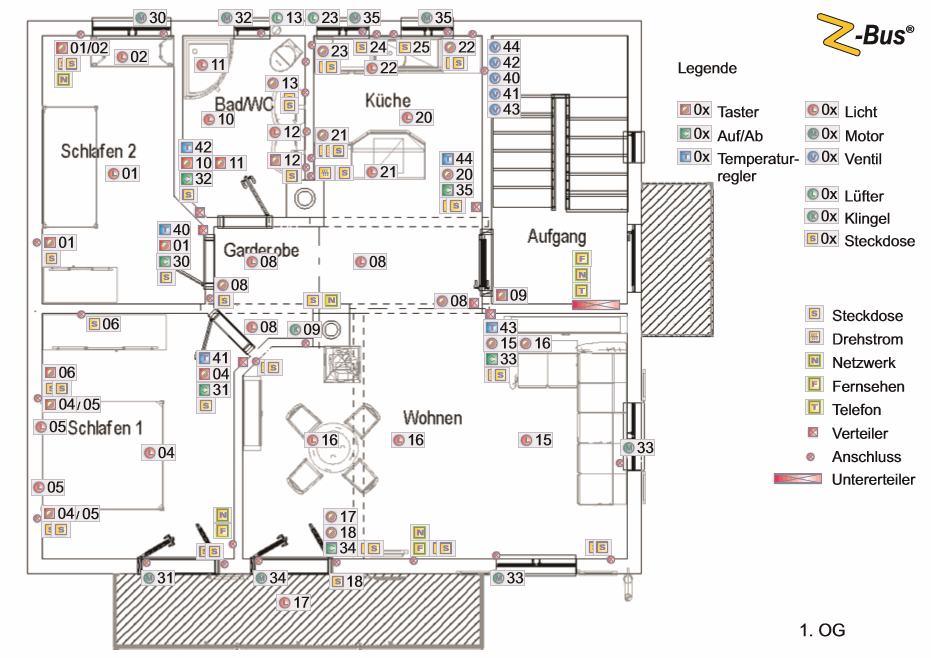 Anfang 2016 hat Fa. Zimmermann ein Rechenbeispiel für eine Wohnung (s.r.) mit ca. 40 zu steuernden Lampen/Heizungsthermostaten/Rolläden auf der Firmenhomepage veröffentlicht. Im Beispiel sind alle Sender und Empfänger enthalten incl. Bus/Netzwerk-Interface zur zusätzlichen Steuerung über PC, Tablet und Smartphone. Die Kosten für diese gesamte Elektronik betragen incl. MWSt etwas über € 7.000,00. ![]() 3. Bus-Steuerung vom PC aus