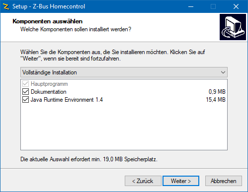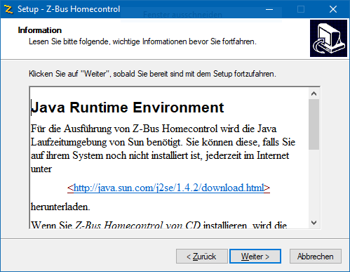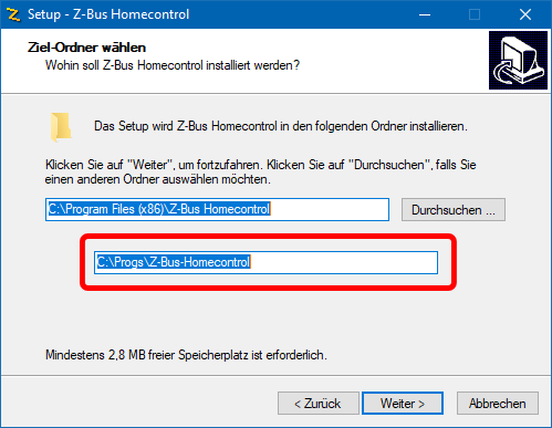 Ohne diese Version von Java läuft der Z-Bus-Controller nicht. Sie dürfen also später die JRE nicht aktualisieren! Dann müssen Sie einen Zielordner wählen (s.r.). Folgen Sie nicht dem Vorschlag, sondern wählen Sie z.B. C:\Progs\Z-Bus-Homecontrol, wie rechts rot markiert ins Bild montiert ist. .